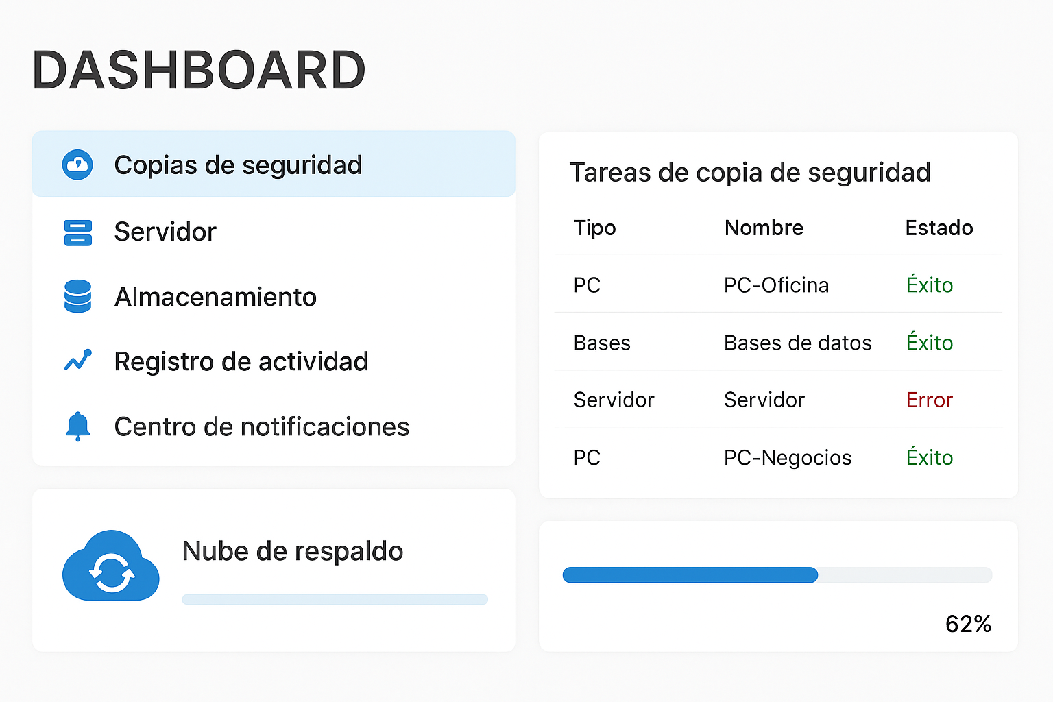 Copia de seguridad automática, sincronización entre equipos y gestión simplificada.
